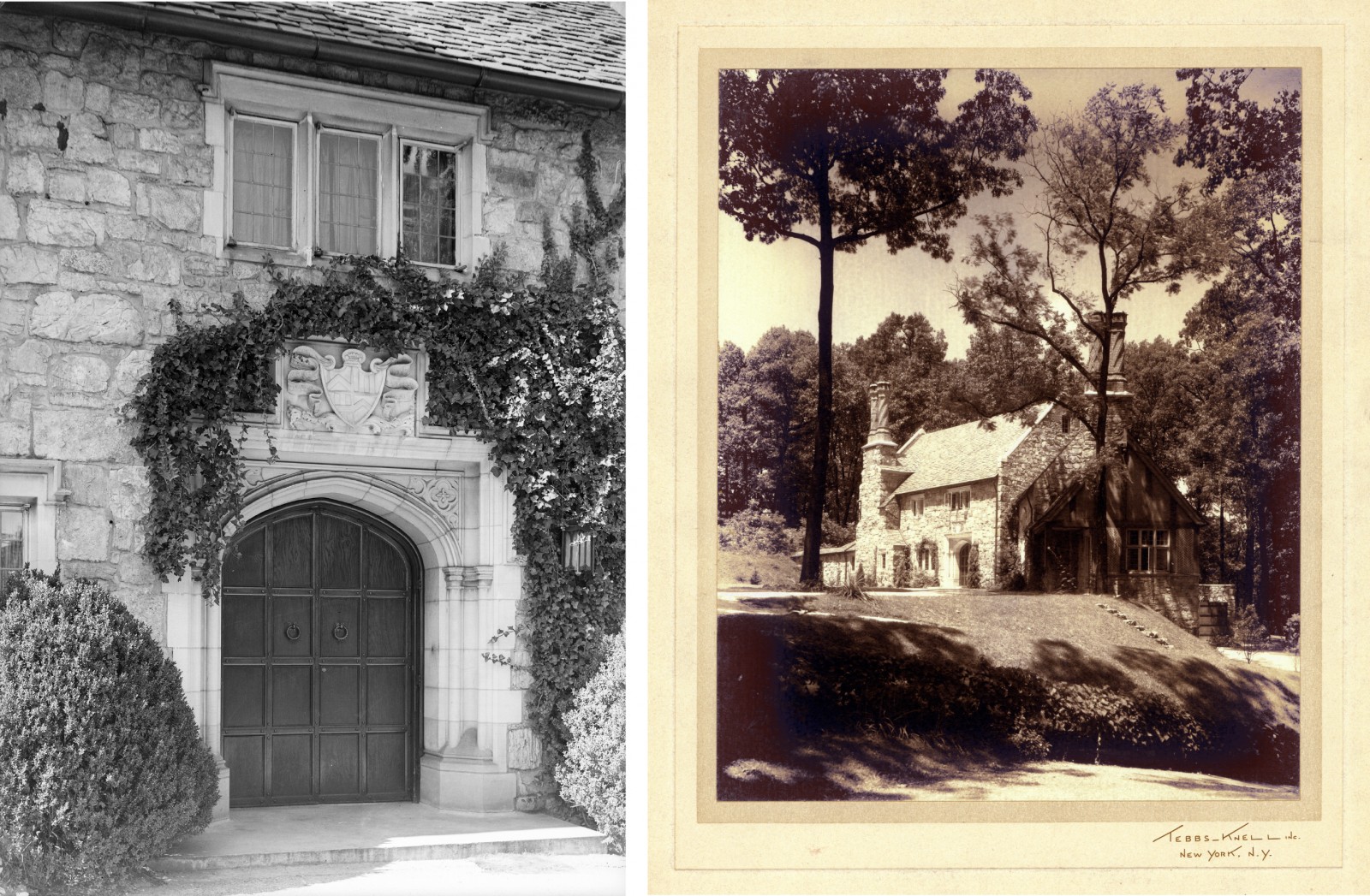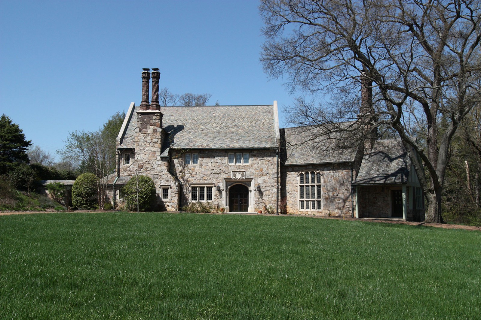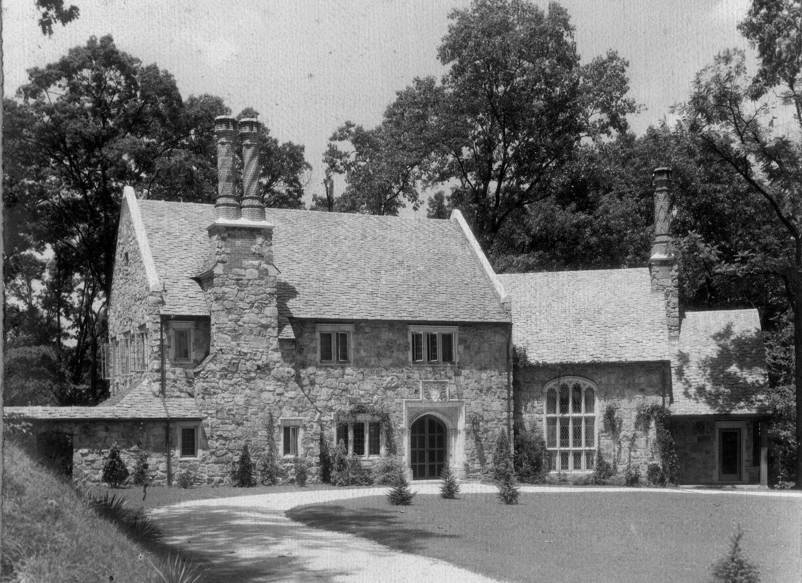 The walls are faced with honey-colored field stone and the roof is of slate. The doorway, window, and chimney details are notable, closely patterned on elements of the English Tudor period. The chimney in particular is one of the most recognizable elements of the well-known Kingston Pike residence, with a unique styling that is almost sculptural.