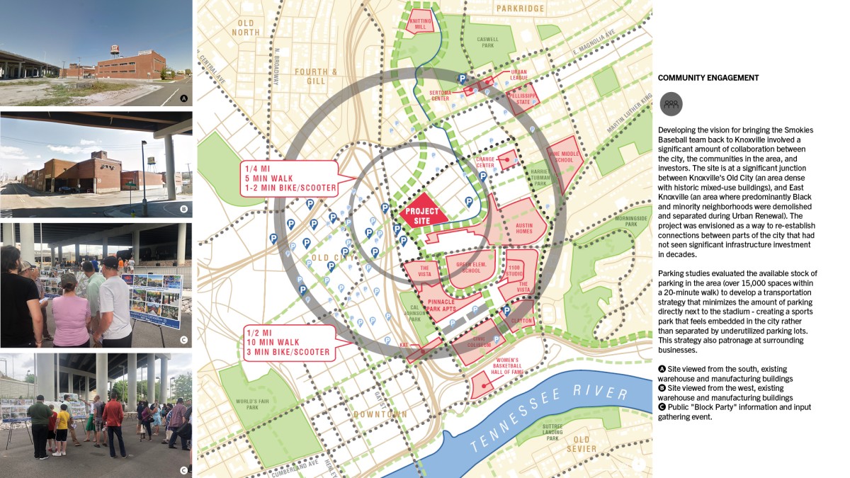 The design carefully considers the challenges and aspirations of the site — particularly pedestrian and visual connectivity between the Old City and East Knoxville. These connections are a purposeful part of the design, intended to reconnect to downtown the predominantly Black and minority neighborhoods that were demolished and separated during Urban Renewal. GEM Associated Architects and Boyd Sports have worked closely with community leaders, the Beck Cultural Exchange Center, and Knoxville Area Urban League on meaningful connections to encourage grassroots restoration of these communities.