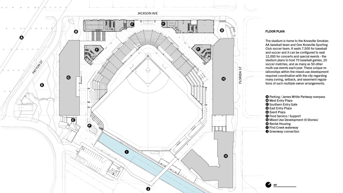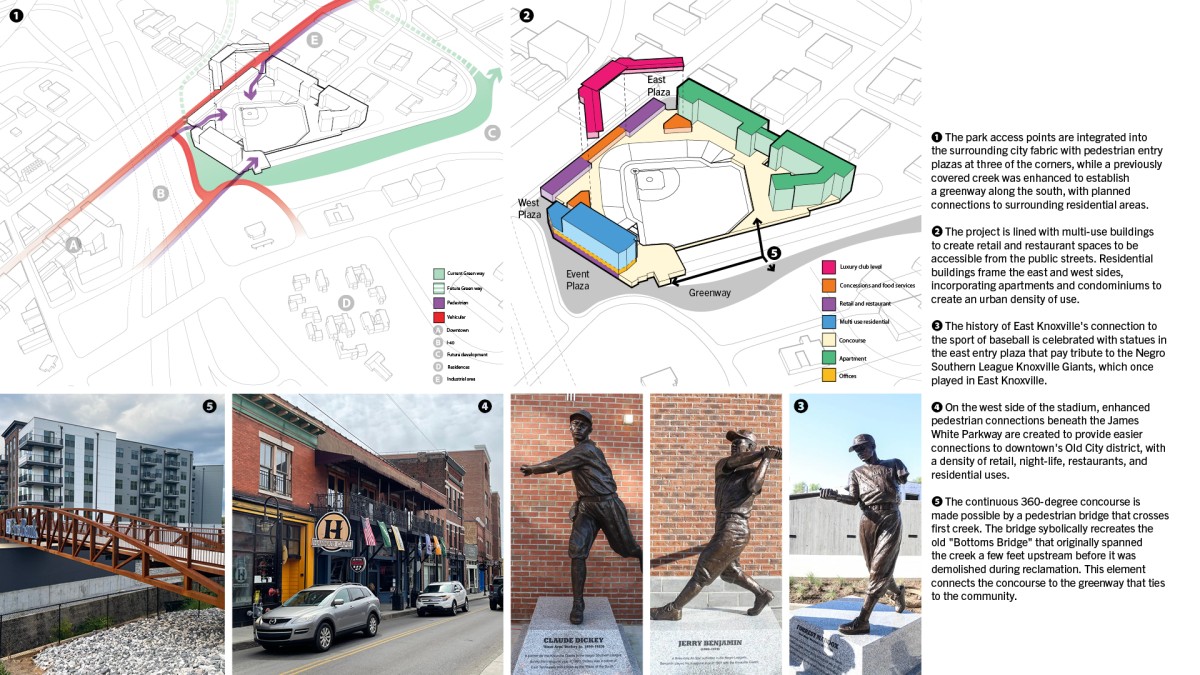 The stadium is ringed with buildings that house retail, offices, and residences, and that are designed to extend the visual aesthetic of the historic buildings in the Old City. Entrances to the stadium are oriented to pedestrian, not vehicular, traffic. The west entry, from the Old City, includes a large plaza akin to Market Square. The east entry, from Florida Street, features another pedestrian plaza and artifacts of the history of baseball in Knoxville, including the Knoxville Giants Negro League Baseball team.