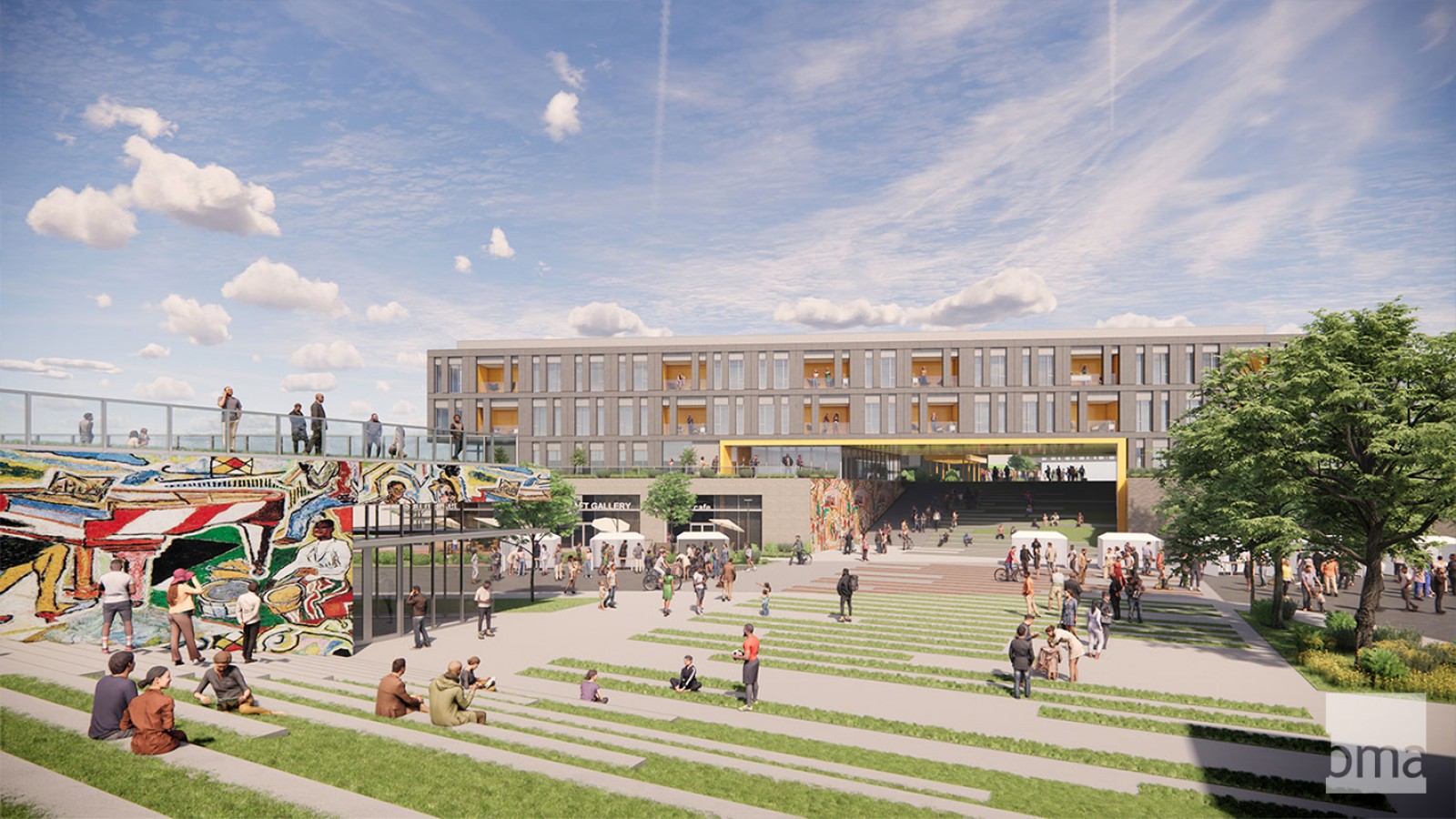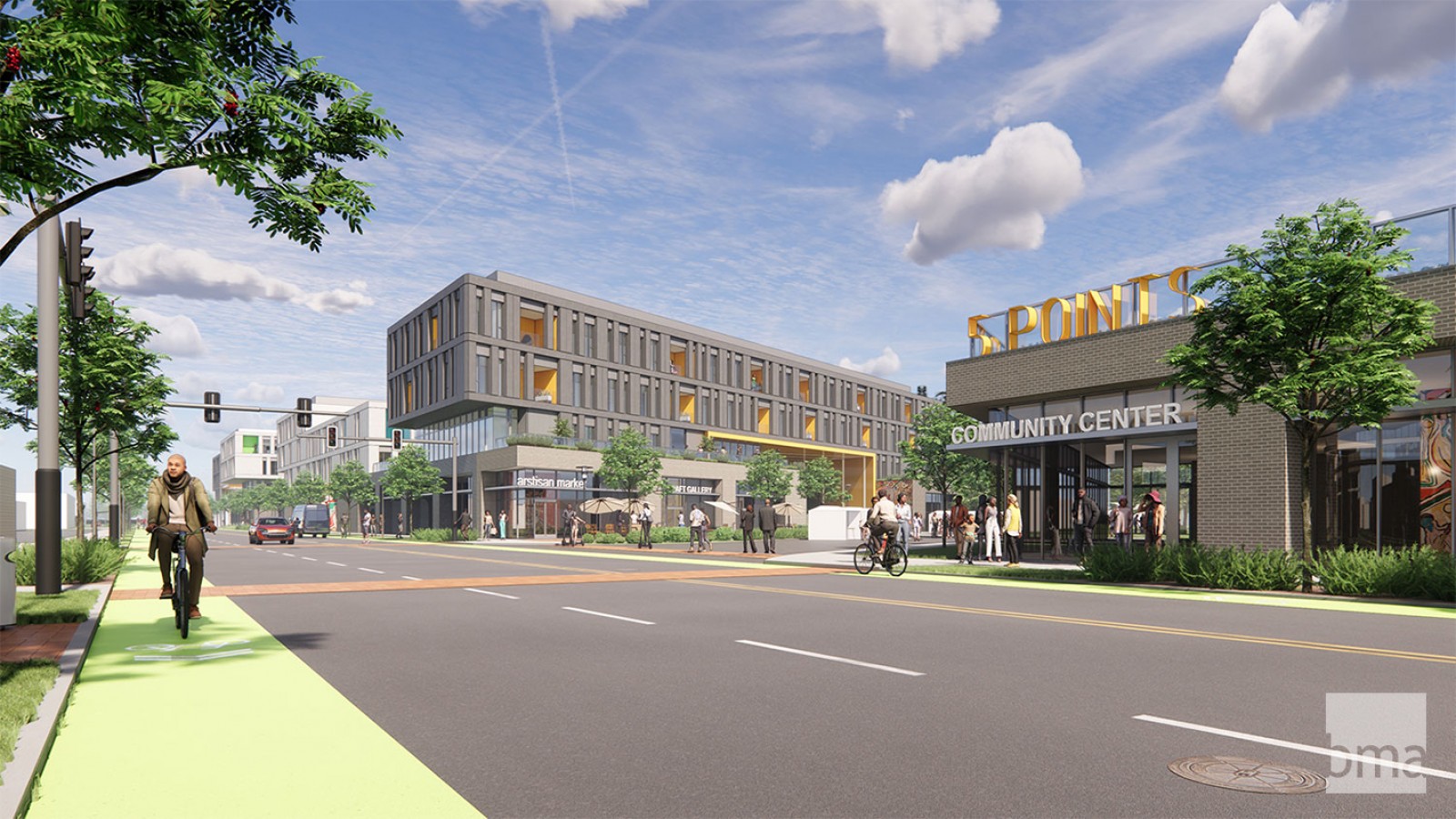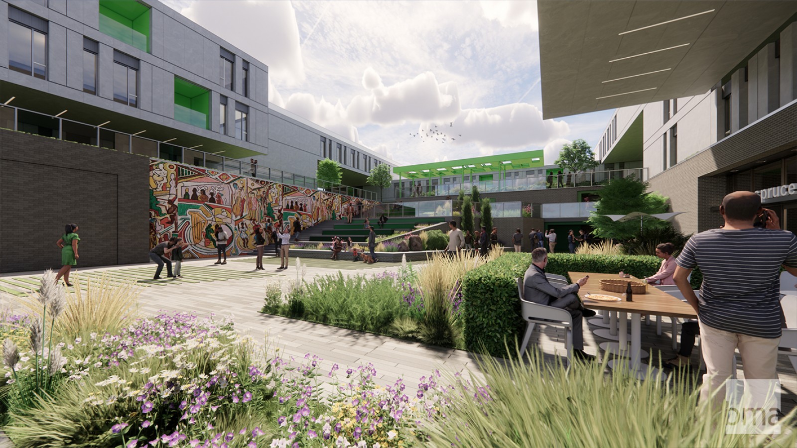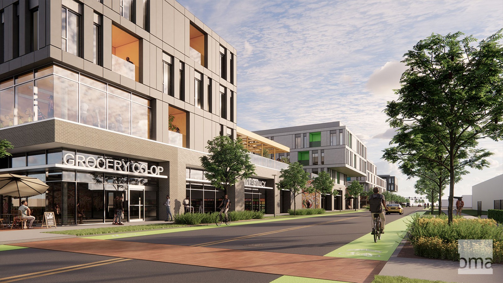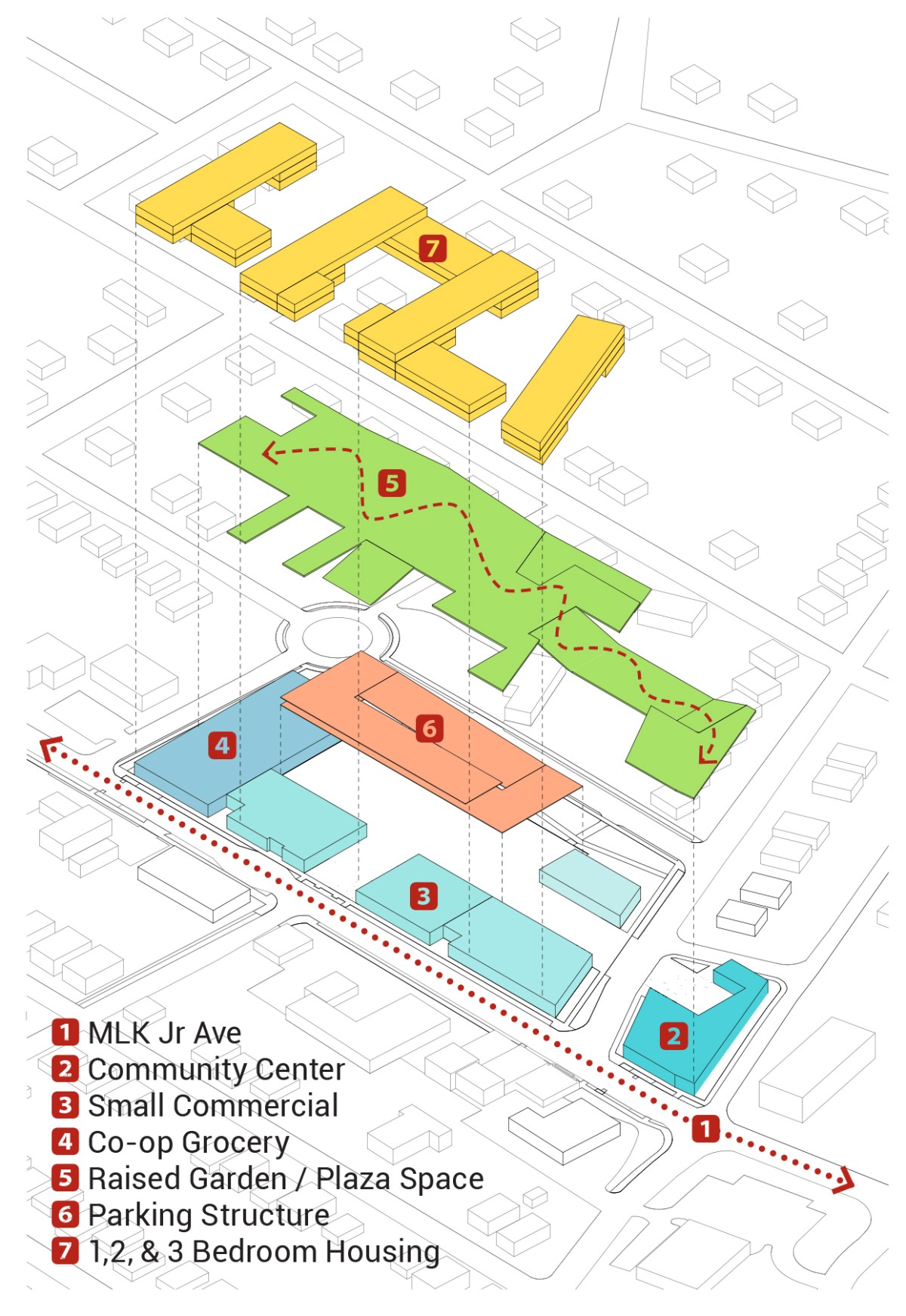 The ground floor of the mixed-use development contains ample opportunities for locally-owned restaurants, a co-op grocery store, artisan markets, and other community-based retail spaces. Above are the apartment buildings, which weave across the entire site, creating and defining internal courtyards, parks, and other neighborhood amenities within the design.