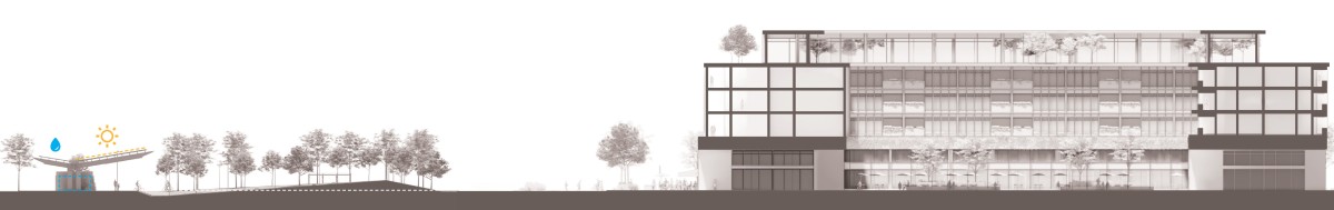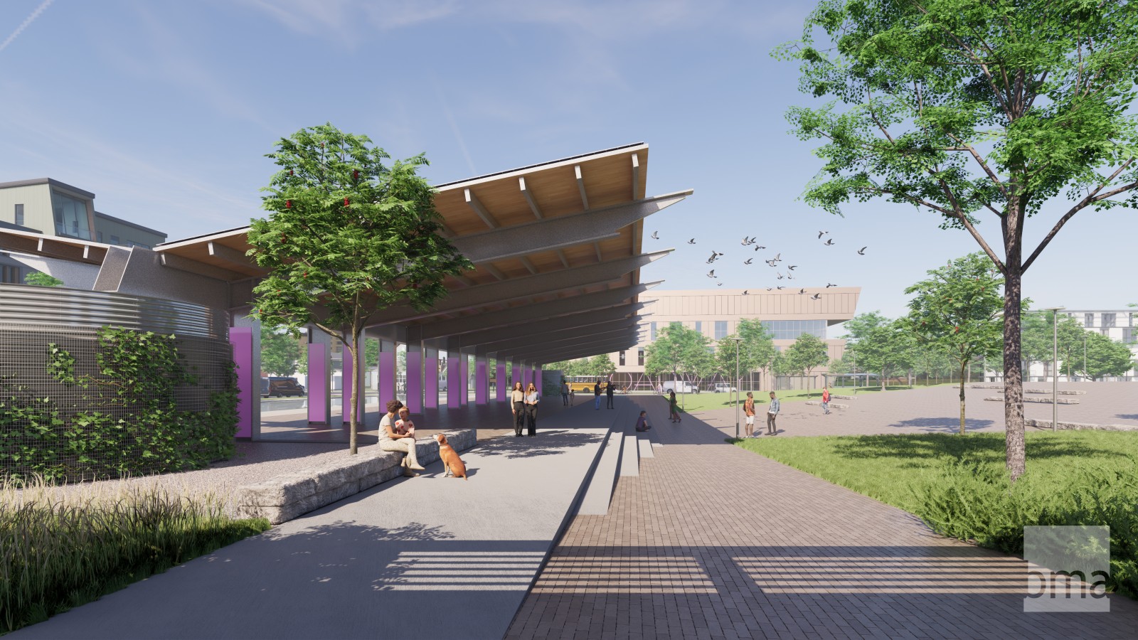 The community plaza connects the adjacent new developments with a large open space, suitable for farmers’ markets, performances and community gatherings. The plaza also features a large pavilion with solar panels and cisterns to harvest rainwater and sunlight, as well as permeable pavers to help mitigate stormwater.