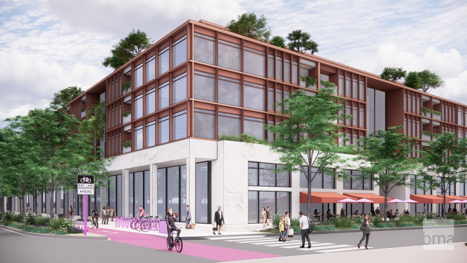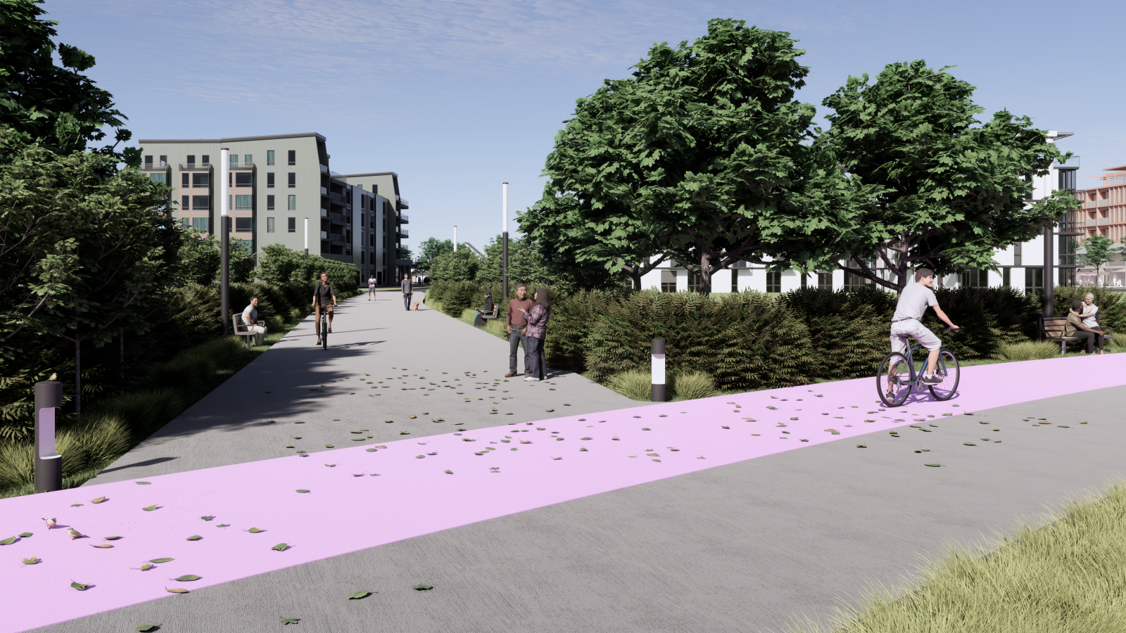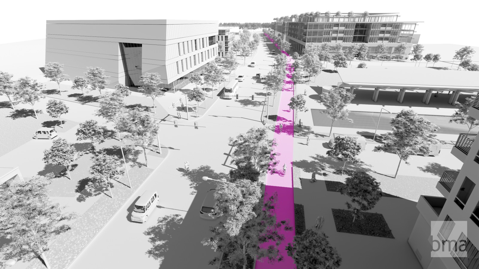 The area is reimagined as a vibrant new neighborhood connected by a perimeter greenway, or in this case, a PINKway. The PINKway connects a walking path along the creek to a new bike lane along Broadway. Separated by a green median, the pink bike lane sits nestled along an enlarged sidewalk to give pedestrians separation from the busy road as they enjoy shopping and dining along the new developments.