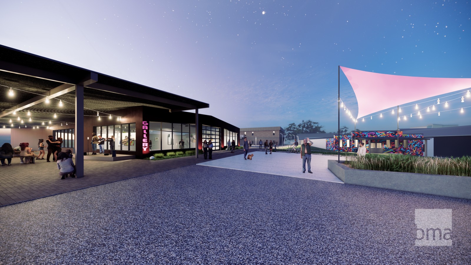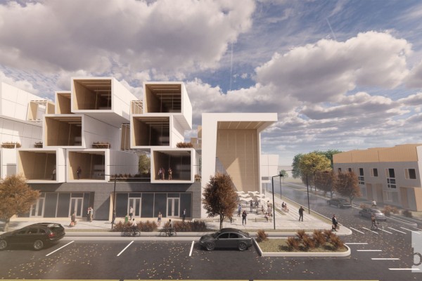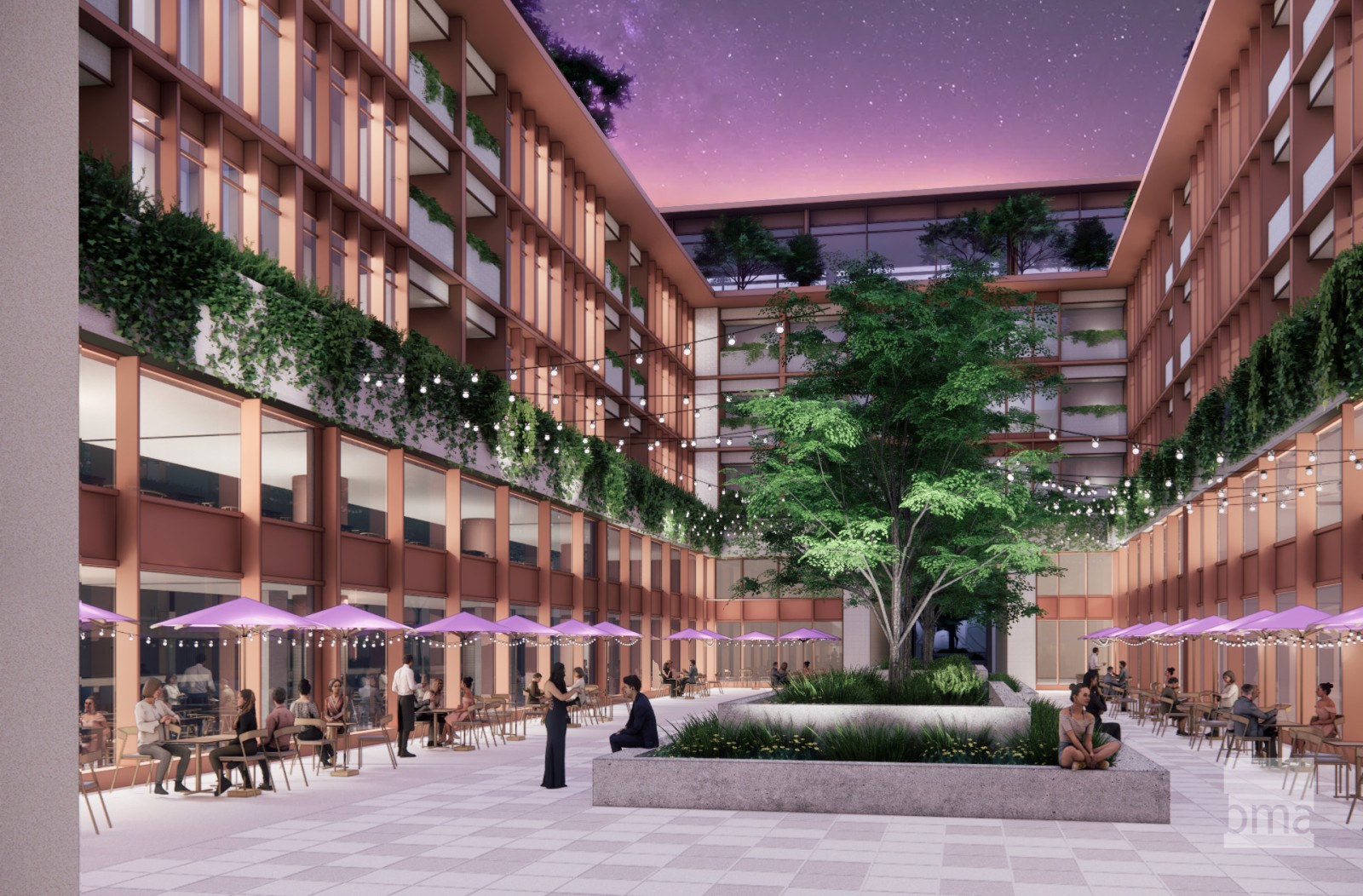 The north end of the site introduces three mixed-use developments that provide inner public courtyards for restaurants and extend the proposed community plaza inside. The street-facing façade provides retail opportunities. By day, the courtyards act as an urban greenspace, providing outdoor seating for restaurants and extending the Broadway Square inside. At night, these courtyards become available to the public as a rental space for events.