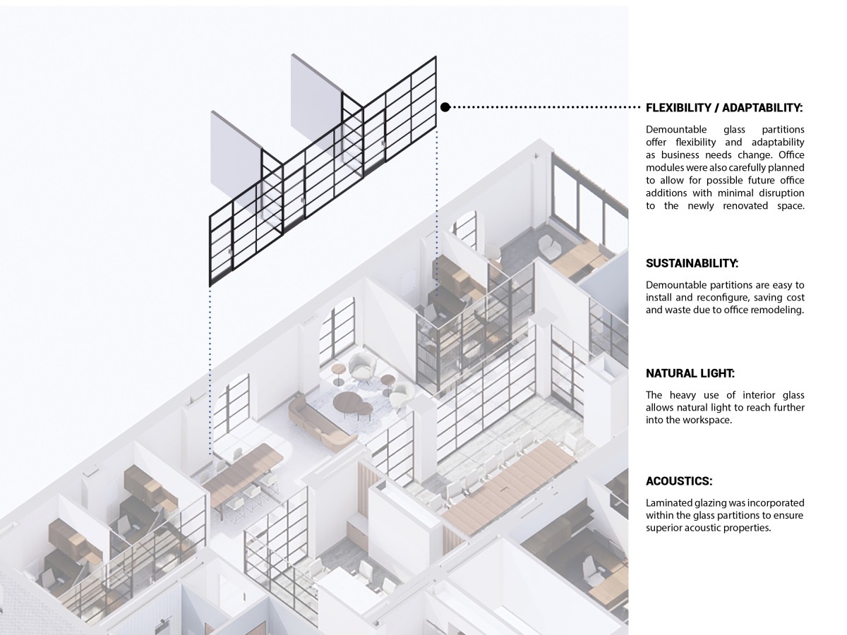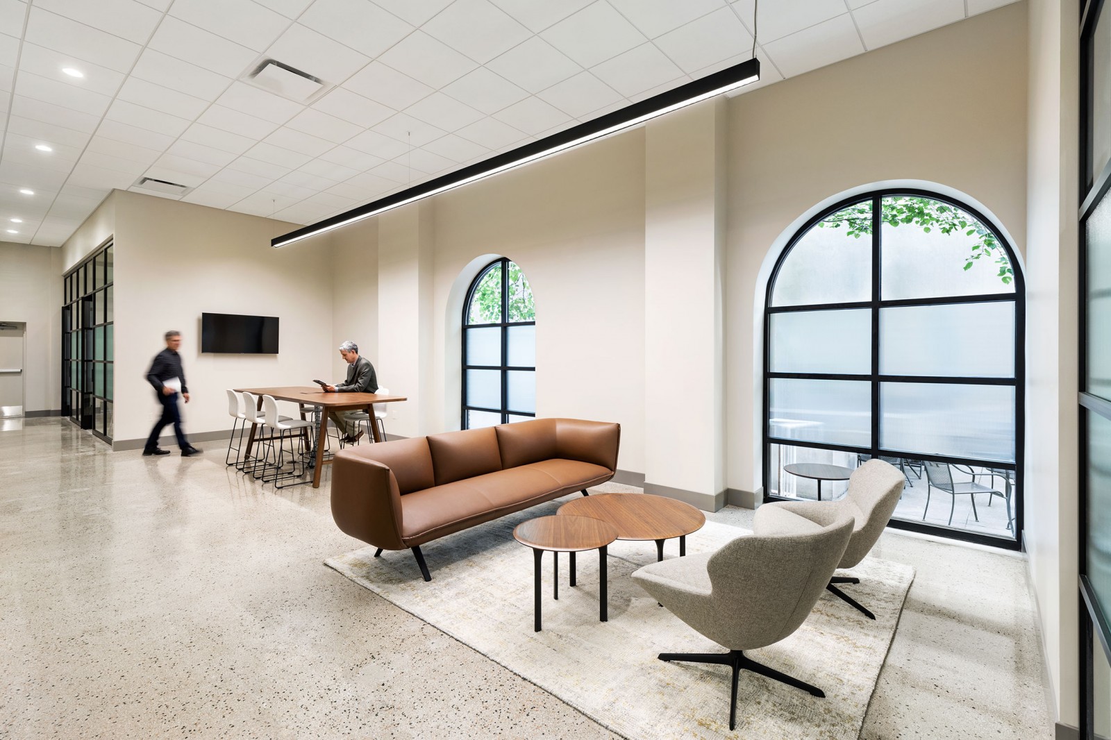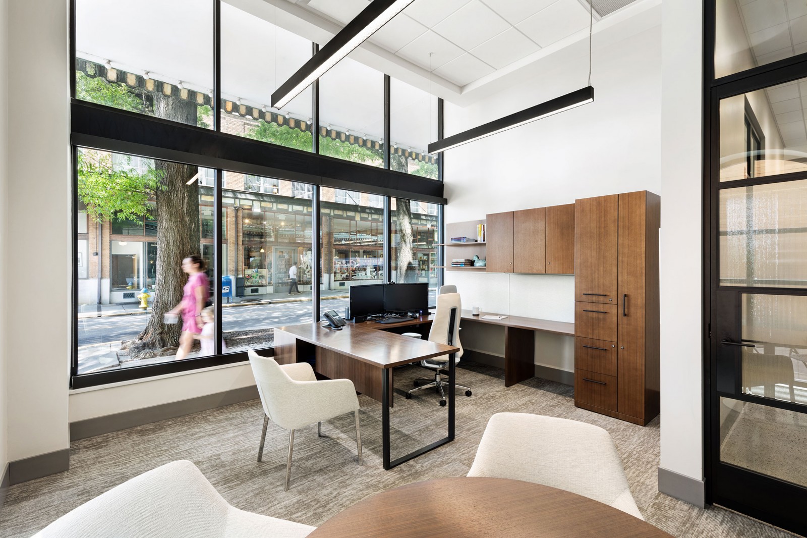 The renovation combined several separate tenant spaces into one functional office with a highly efficient floor plan arrangement. The design prioritizes easy circulation and the feel of an open office — while also allowing for visual and acoustic privacy. The interior design reveals & restores original terrazzo floors, renews window openings covered by prior renovations, and celebrates the historic detailing of the original architecture.