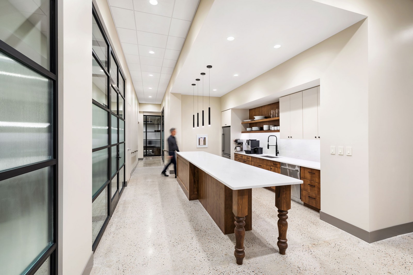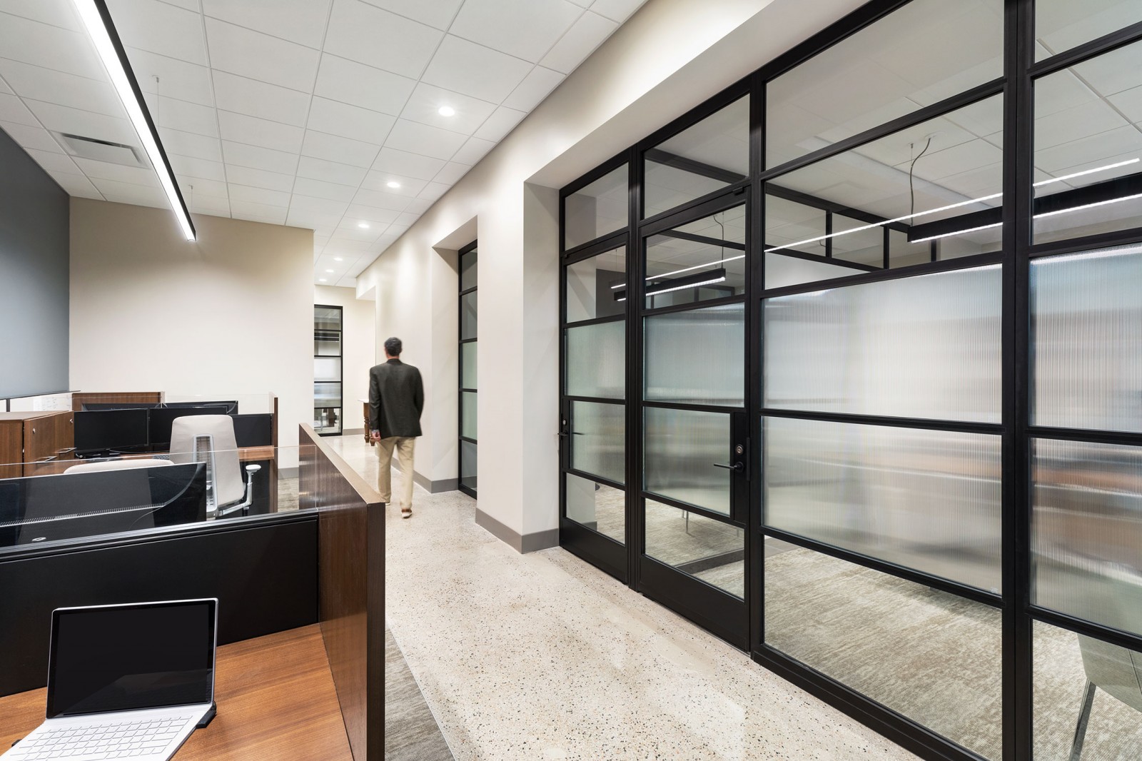 HF Capital’s offices, conference rooms, lounge areas, and employee breakroom are unified by glass partitions throughout the space, allowing natural light to filter throughout. Fluted glazing panes at eye level offer visual privacy. In each office, lighting controls allow users to customize their lighting levels — improving comfort and productivity and reducing eye strain.