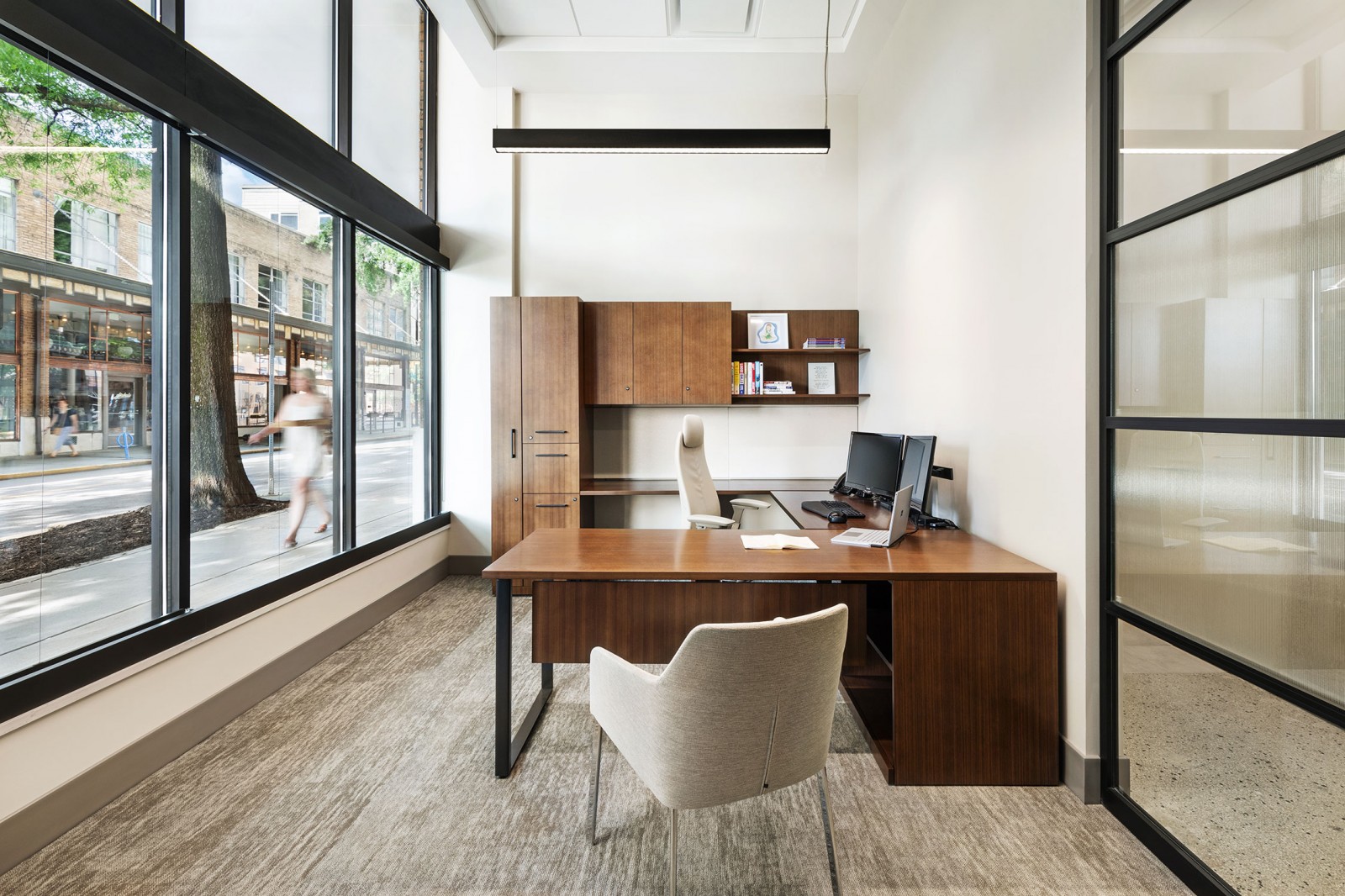 The design utilizes a consistent palette of white, stormy blue and warm natural wood and leather, as well as black metal accents — lending the space a clean and cohesive aesthetic. Adjustable shades allow for privacy in offices situated along the street. Laminated interior glazing improves acoustics, as do ribbed wood feature walls in the conference rooms.