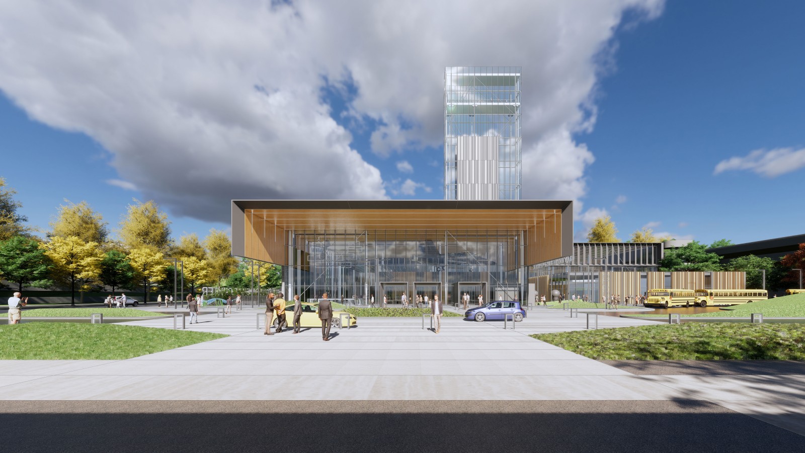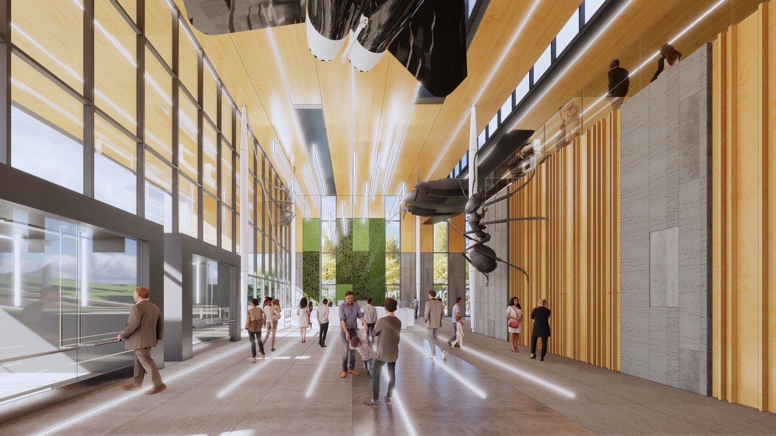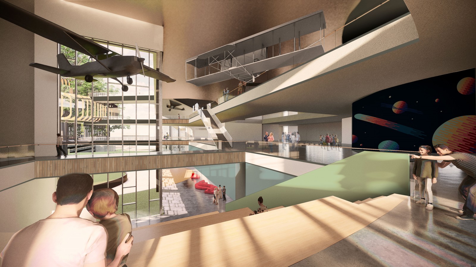 This design is inspired by Knoxville’s Maker City designation. It is constructed of locally-sourced Tennessee marble, patinated metal, perforated terracotta screen. With three stories of exhibit and learning space, this design also has a two-story maker space with views of downtown. Both the interior and exterior spaces of the building are terraced down the sloped site, eventually breaking into an expansive outdoor lawn — open for outdoor exhibits and events. Inside, an atrium brings in natural light and visually connects all three floors of the museum. Outdoors, a greenhouse on-site allows for agricultural and biological learning opportunities while an indoor-outdoor café has views of downtown, the riverfront, and the mountains.