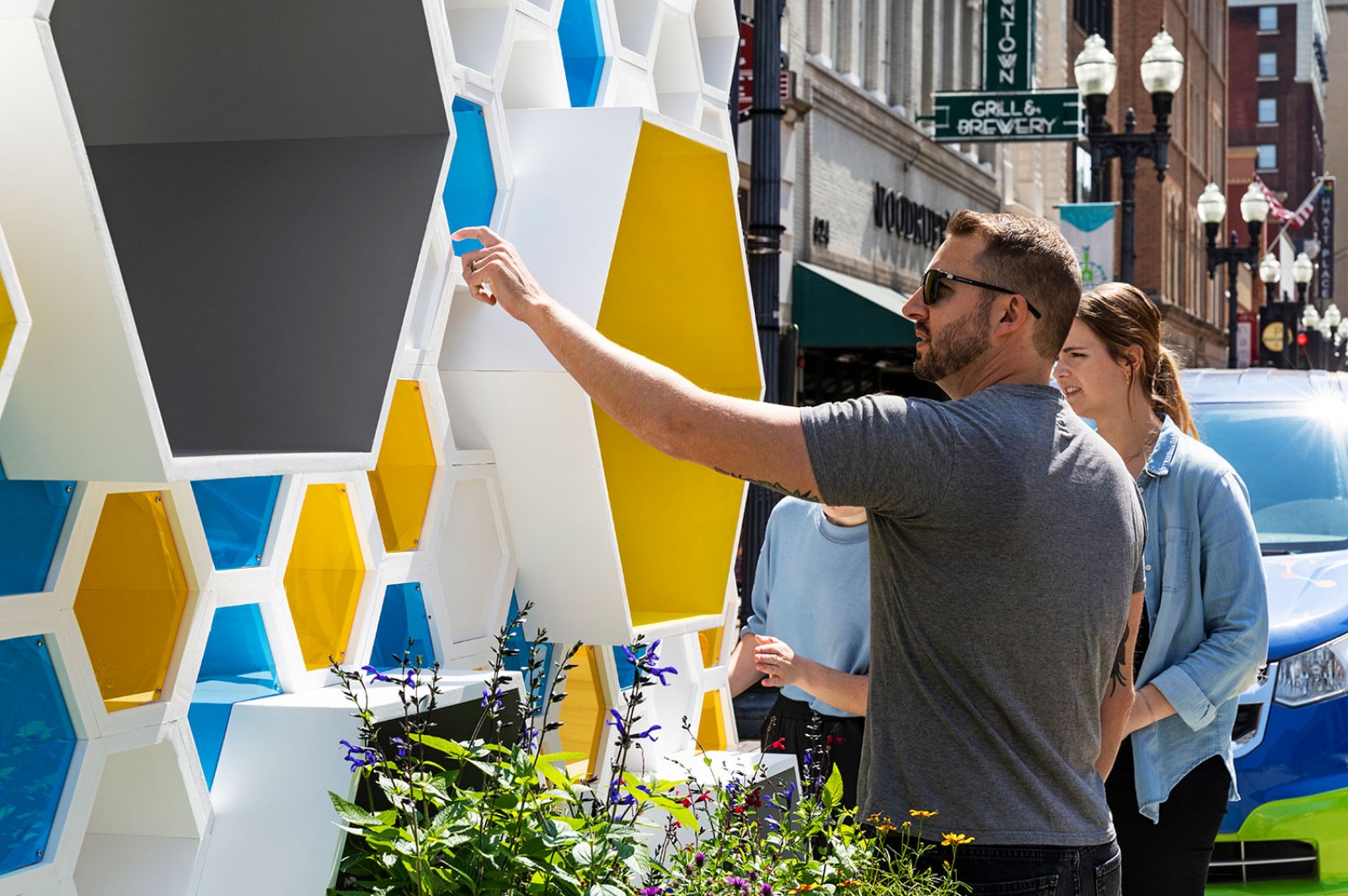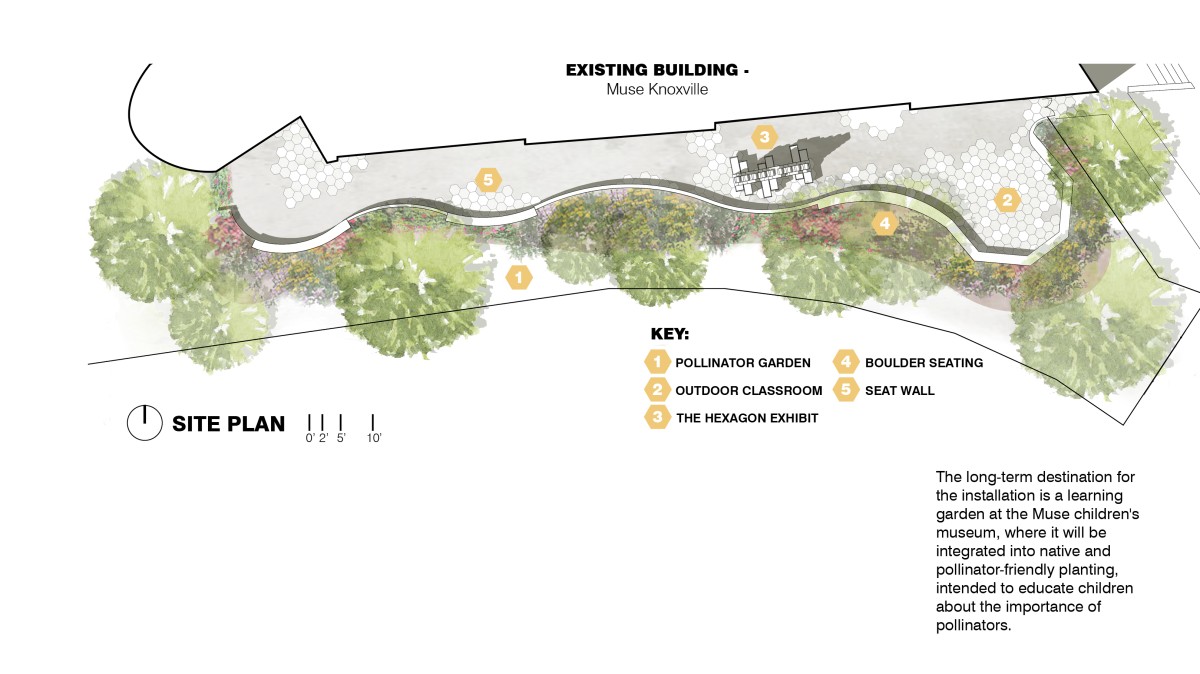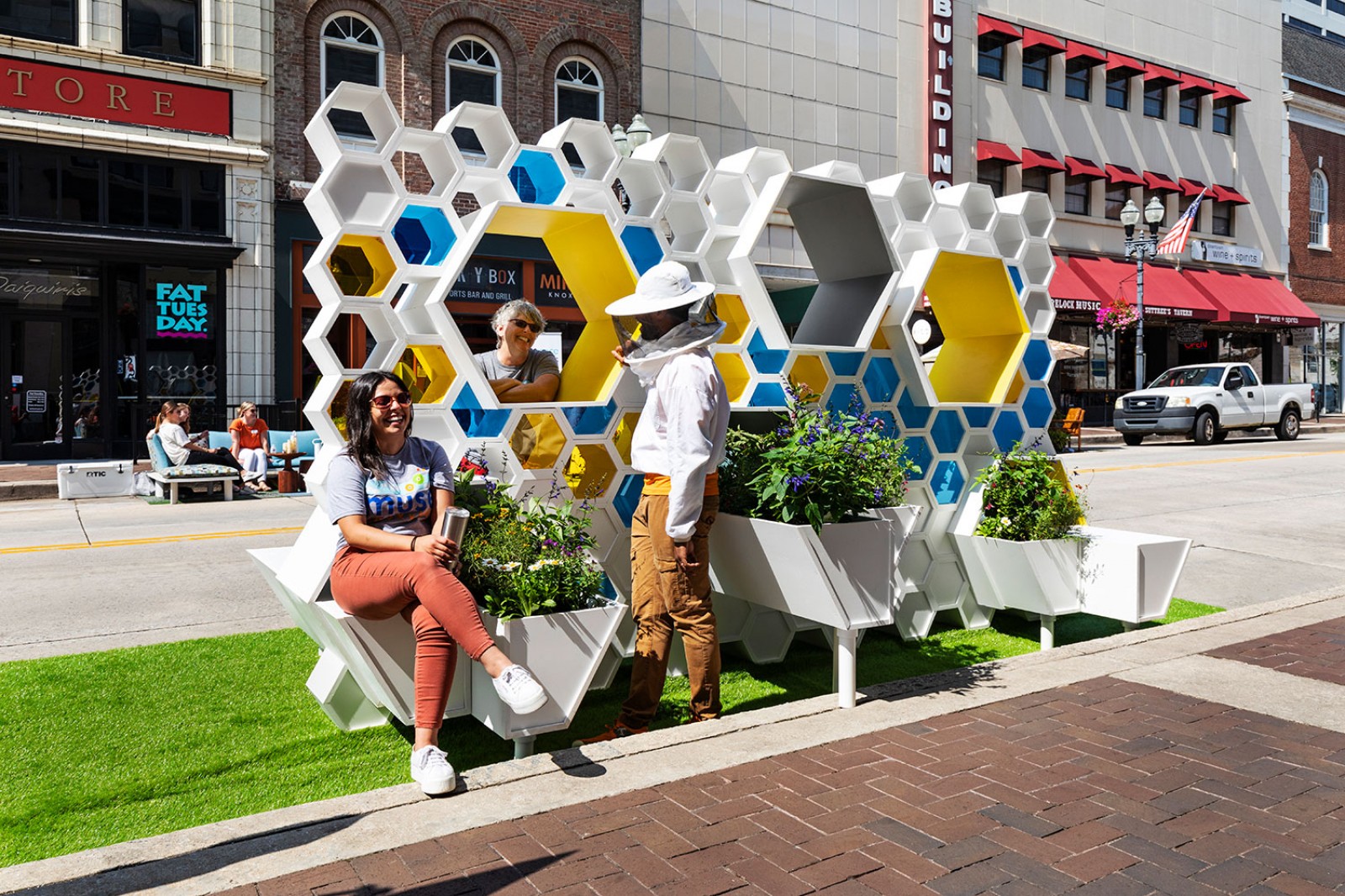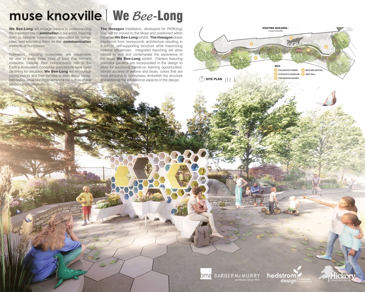Working with the Muse, BMA developed the pro-bono design for The Hexagon to not only function for the new We Bee-Long exhibit, but to also serve as a pop-up “parklet” installation for Knoxville’s annual Park(ing) Day celebration. Park(ing) Day temporarily removes street parking from the core of downtown Knoxville and showcases the benefits of exploiting metered spaces as sites for art, community engagement, and play. The installation of The Hexagon during Park(ing) Day provided the Muse a wonderful opportunity to engage with the general public, raise awareness, showcase their mission, and generate excitement for We Bee-Long.