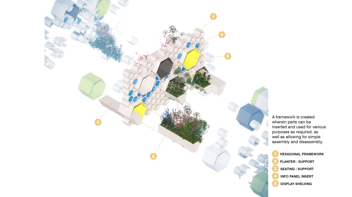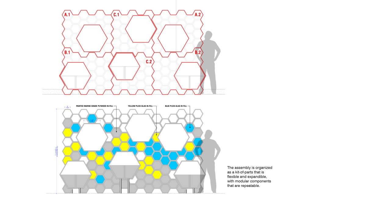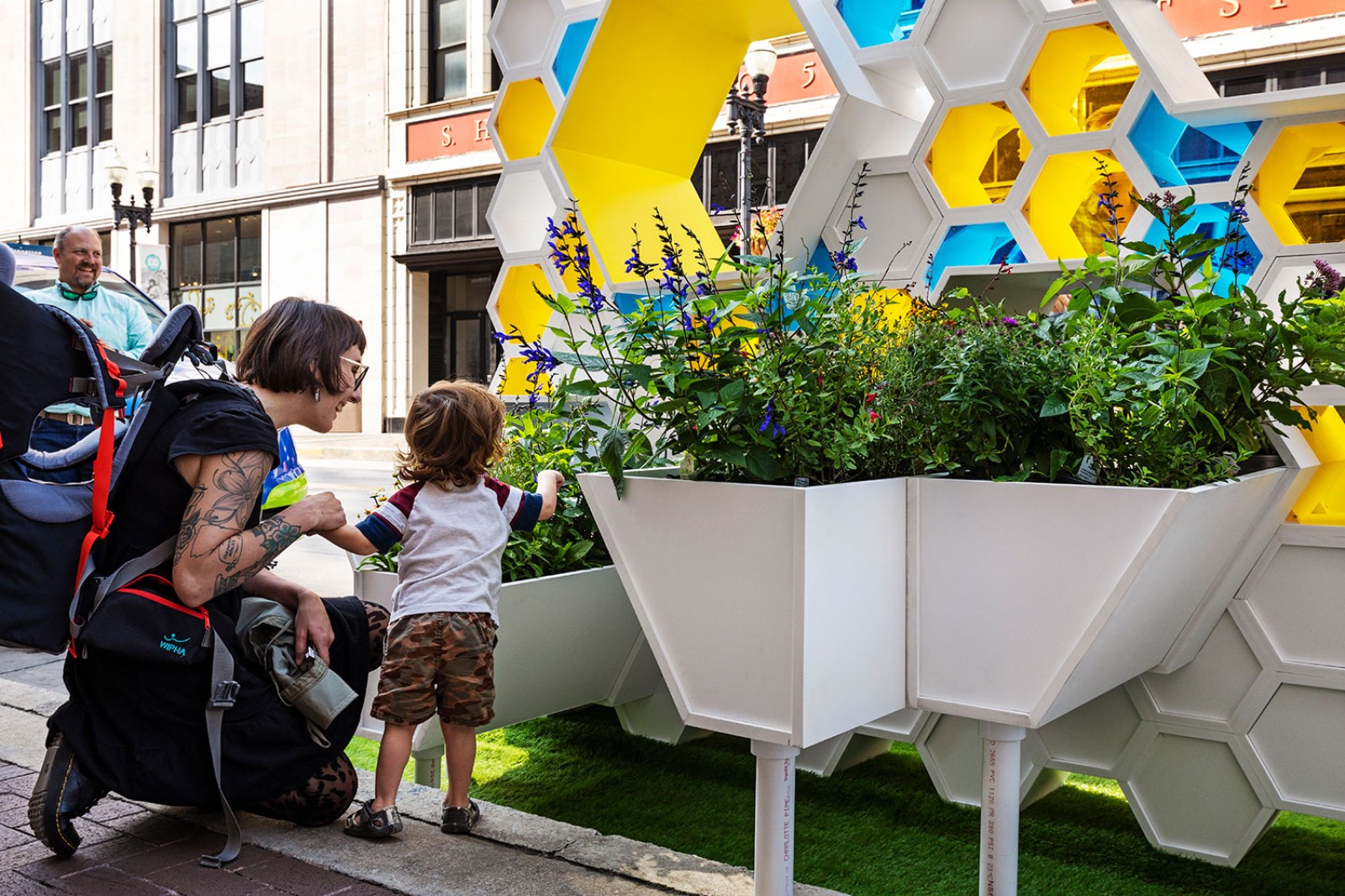 The Hexagon draws inspiration from honeycomb architecture resulting in a robust, self-supporting structure while maximizing material efficiencies. Integrated benching allows visitors to rest and contemplate the experience of the larger We Bee-Long exhibit. Planters featuring pollinator gardens are incorporated into the design to allow for additional hands-on learning opportunities. Vibrant accents of yellows and blues, colors that are most attractive to honeybees, embellish the structure and enhance the educational aspects of the design.