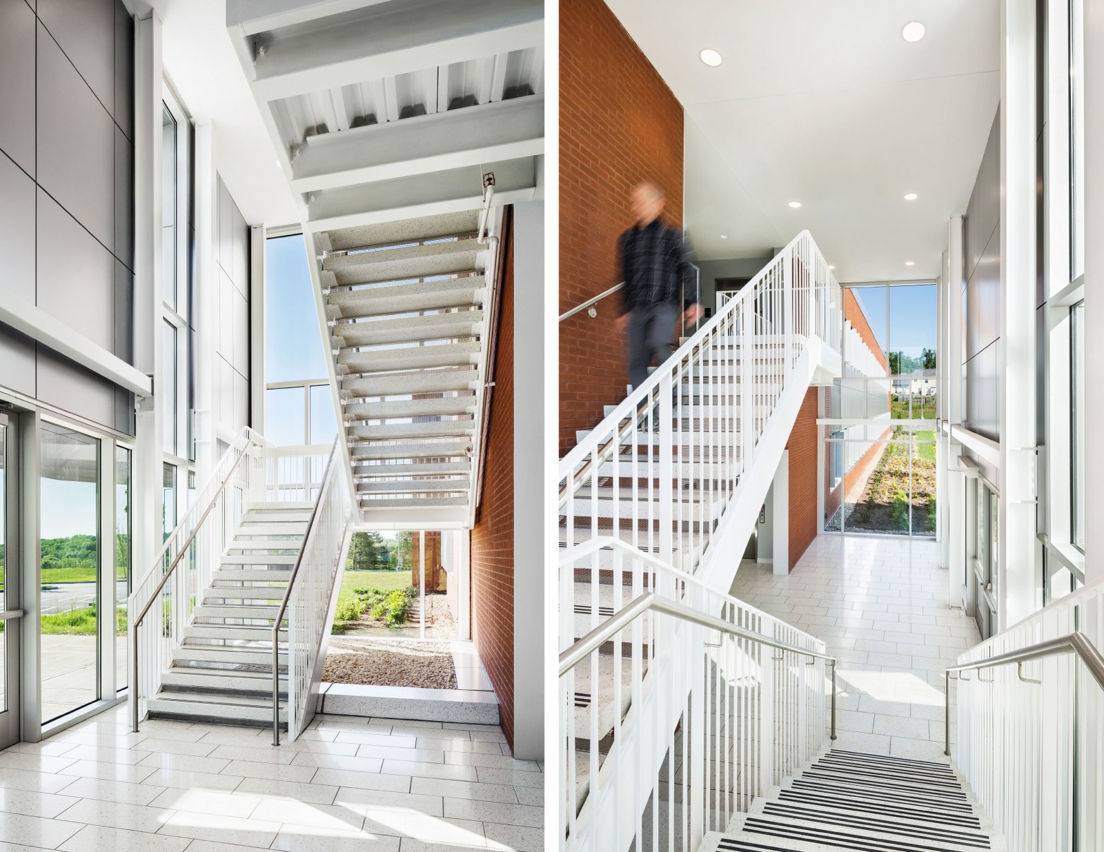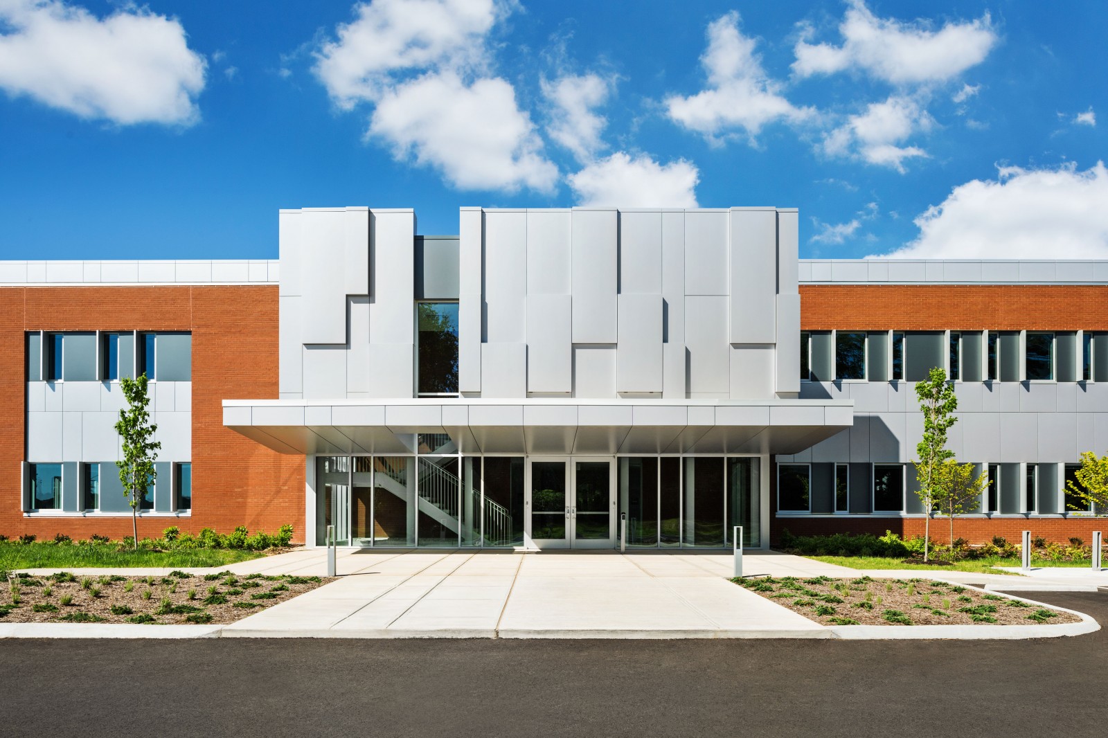 The office building design is simple yet modern. The structure maximizes the efficiency of the office spaces inside while utilizing effective design strategies that worked within the client's construction budget. The building entry becomes an iconic element and the randomized window pattern gives the building an uncommon visual dynamism not typically found in suburban office buildings. The vertical exterior shading not only creates interesting shadow effects across the building elevations, it provides effective solar shading of the windows. This shading, along with energy-efficient building systems, are holistic and sustainable.
