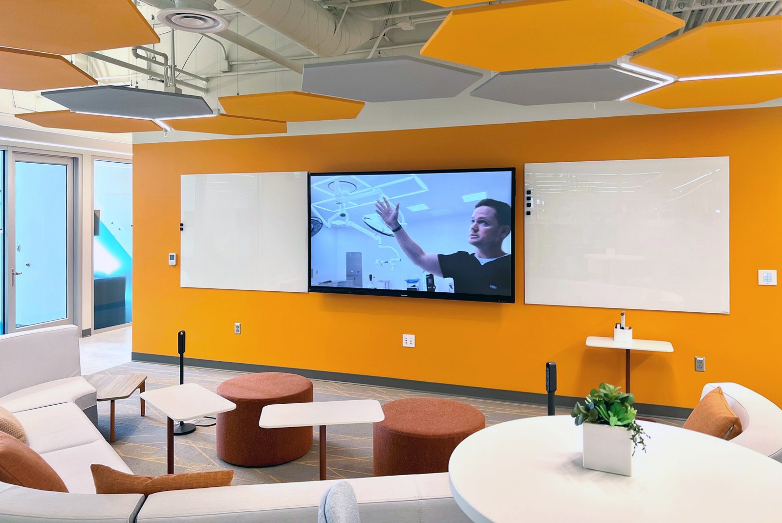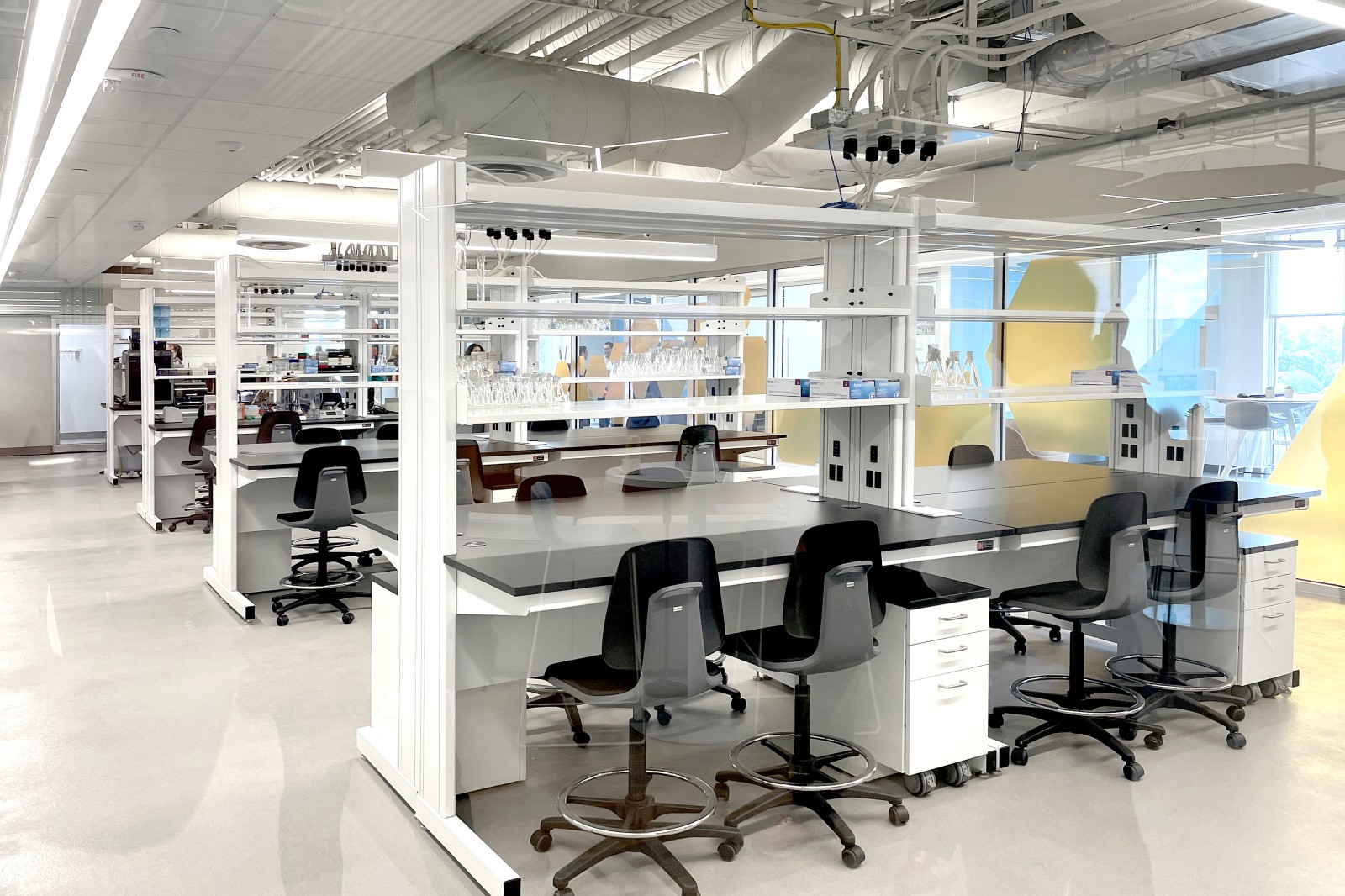 Throughout the space, vibrant colors and dynamic patterns invigorate the interiors, while thoughtfully designed workstations support both focused research and collaborative learning. Key elements, like the integration of glass walls, not only enhance visibility across the space but also showcase the active research happening within. This combination of transparency and light supports the PHE’s goal of fostering an environment that motivates, excites, and reflects the cutting-edge nature of precision health research.