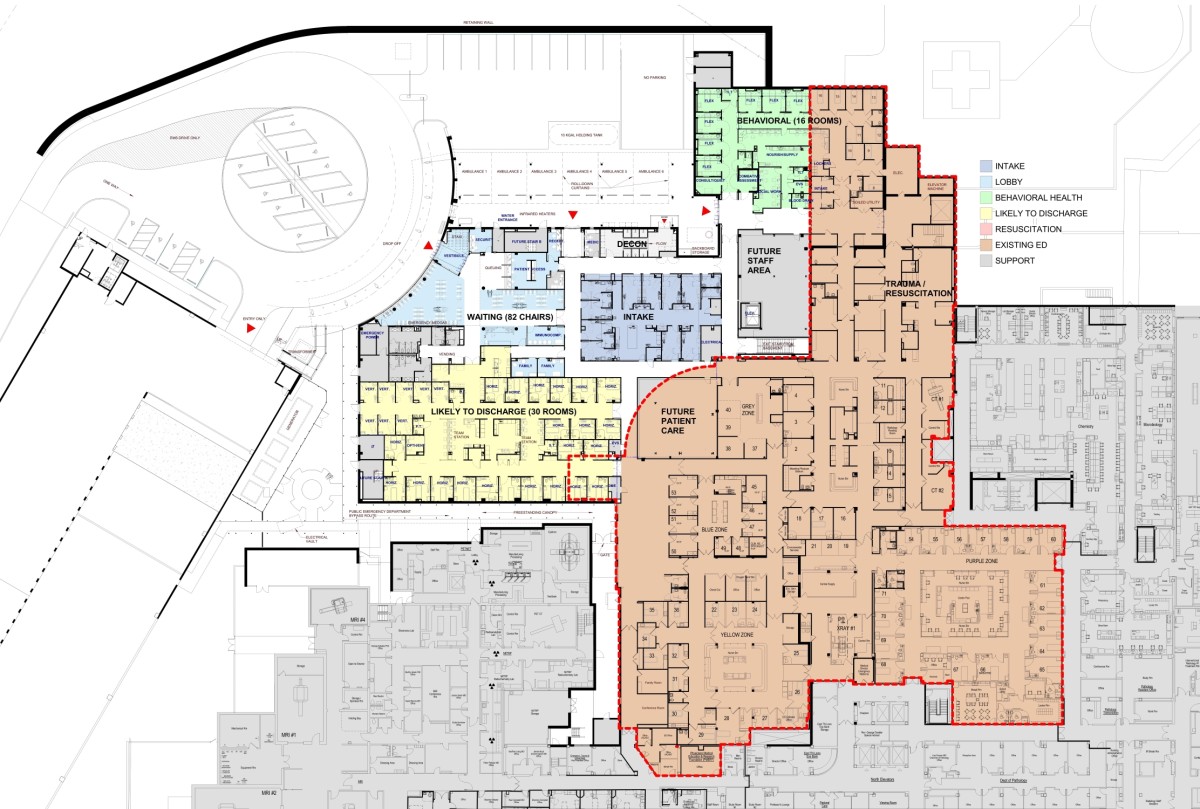 The expansion includes 30 additional patient treatment rooms, 8 new intake rooms, additional behavioral health rooms, and a new "likely to discharge" suite with bays that allow rapid assessment and treatment of ambulatory patients, allowing more patients to be seen, faster.